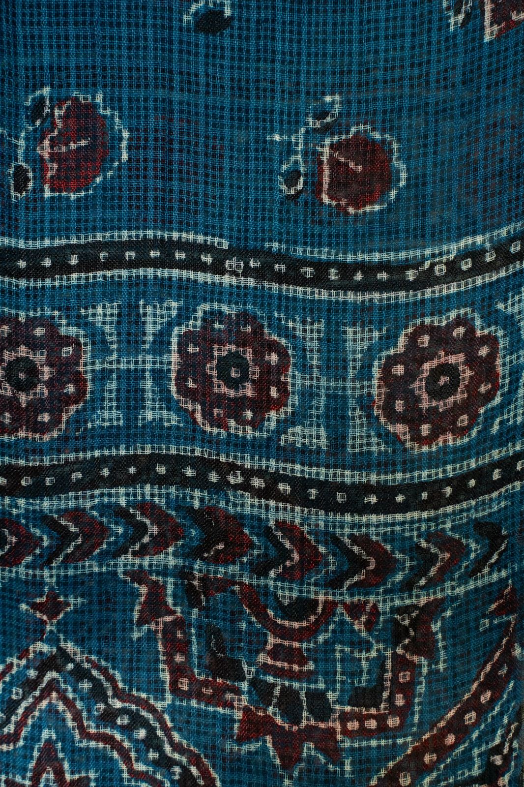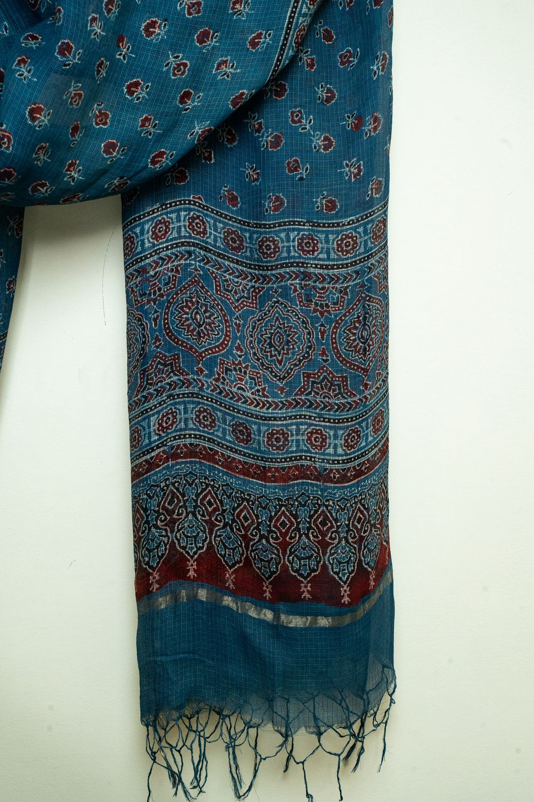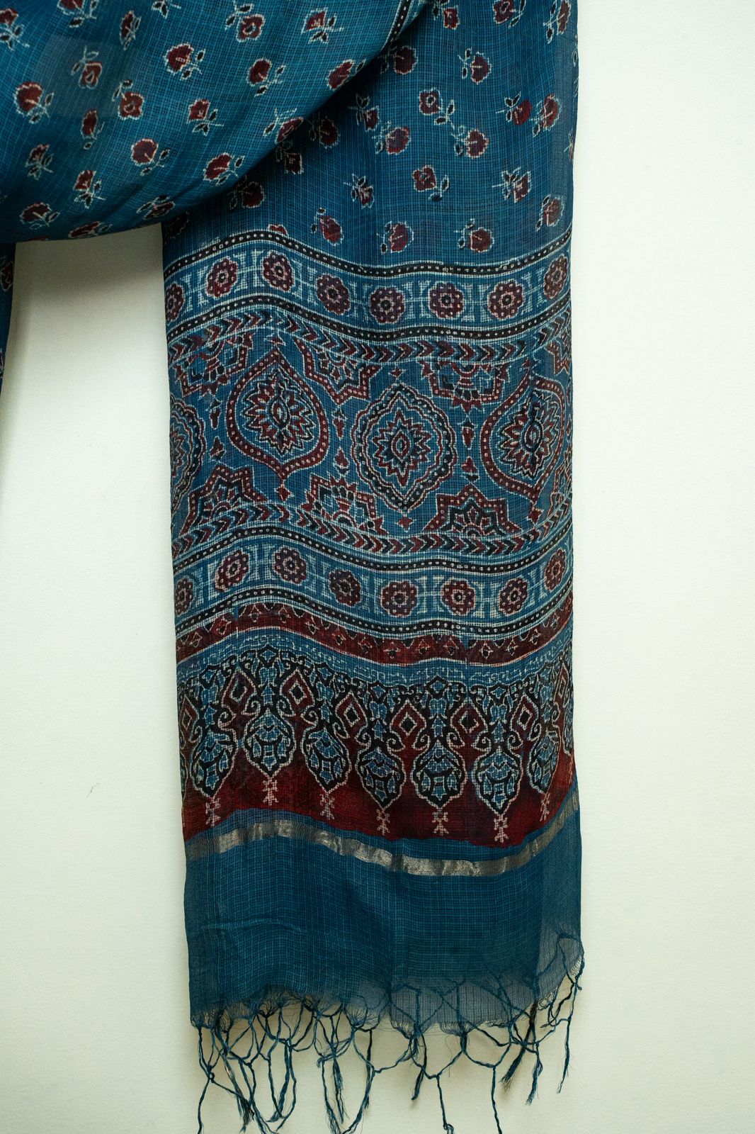 A soft Kota silk dupatta in deep Indigo, adorned with tiny maroon Ajrakh floral bootis and a delicate border.