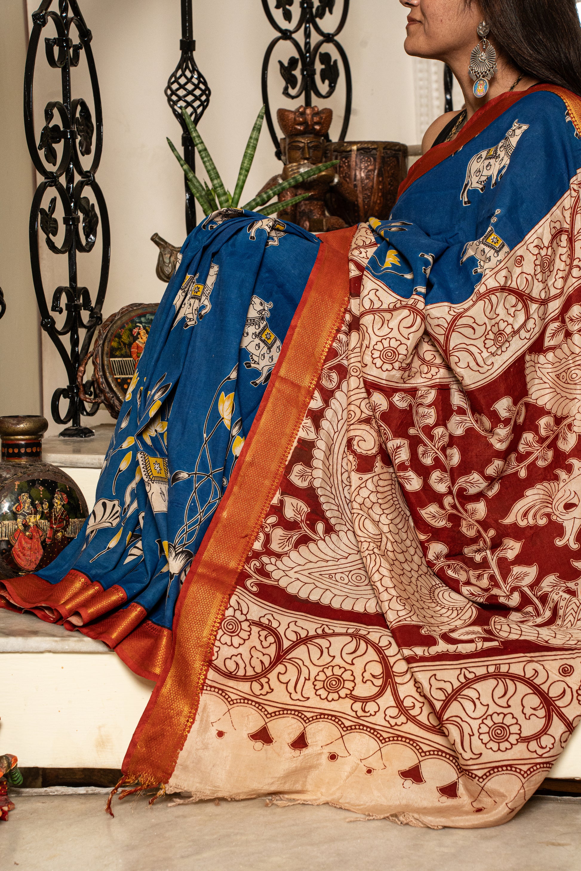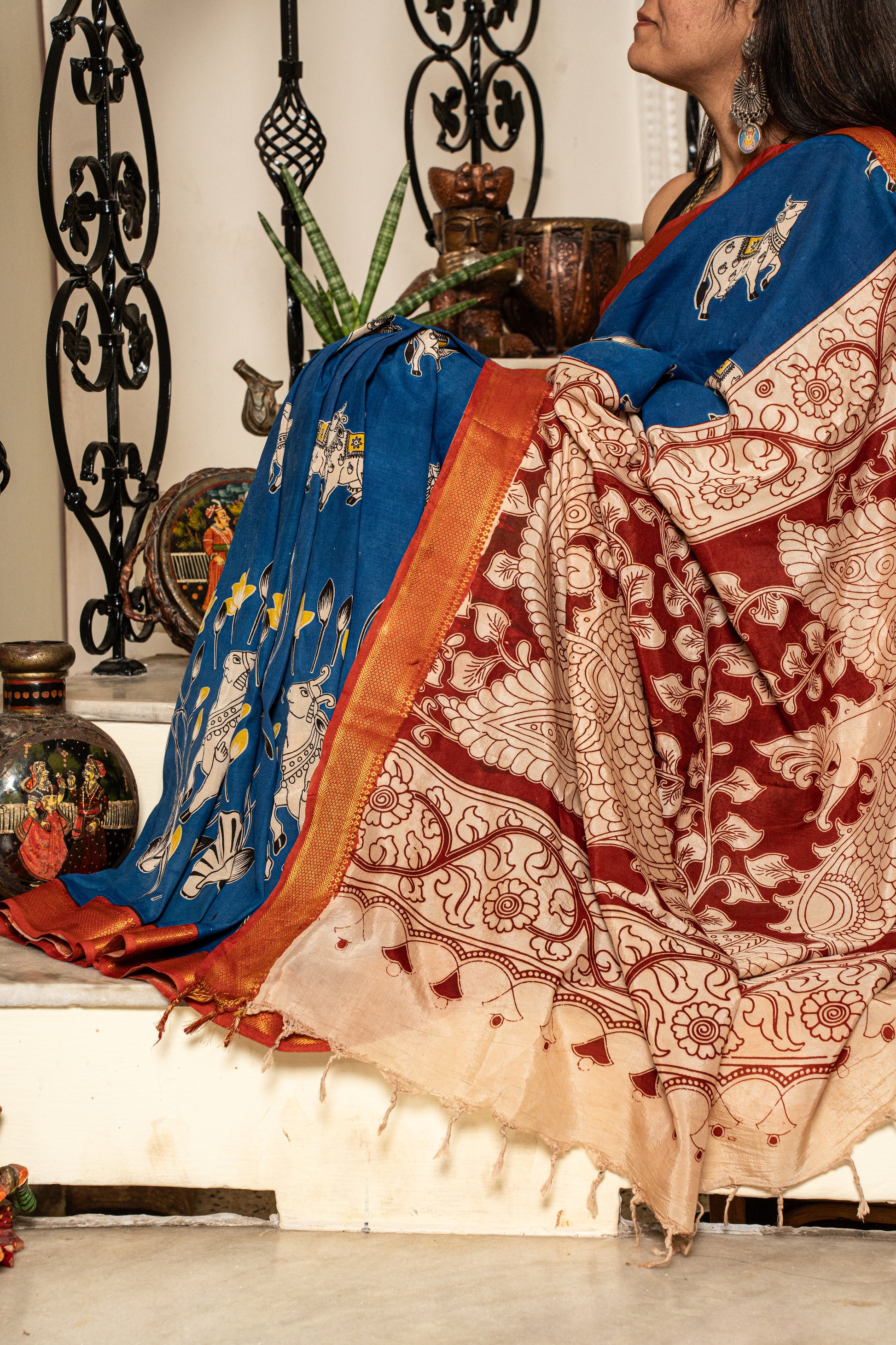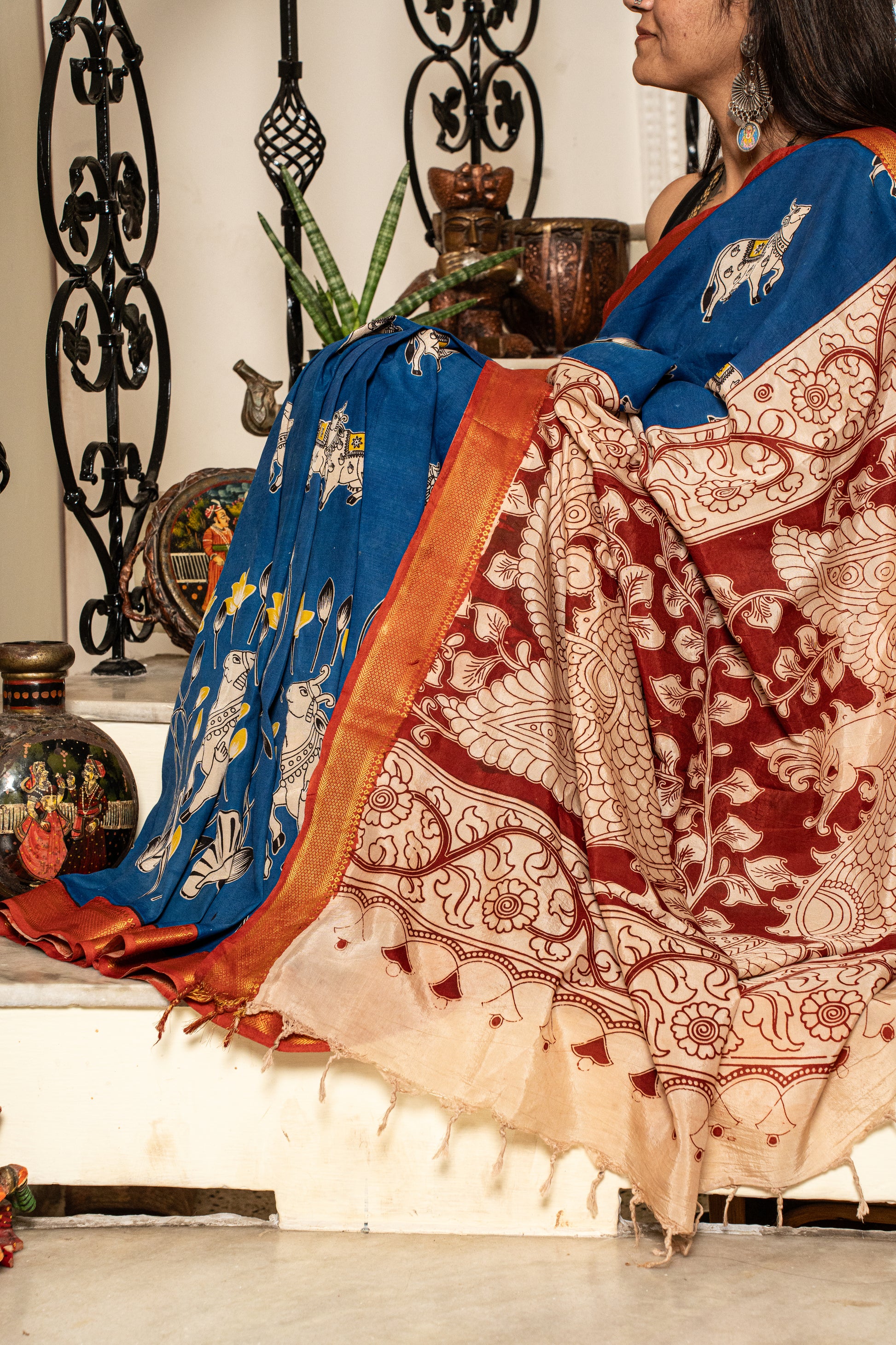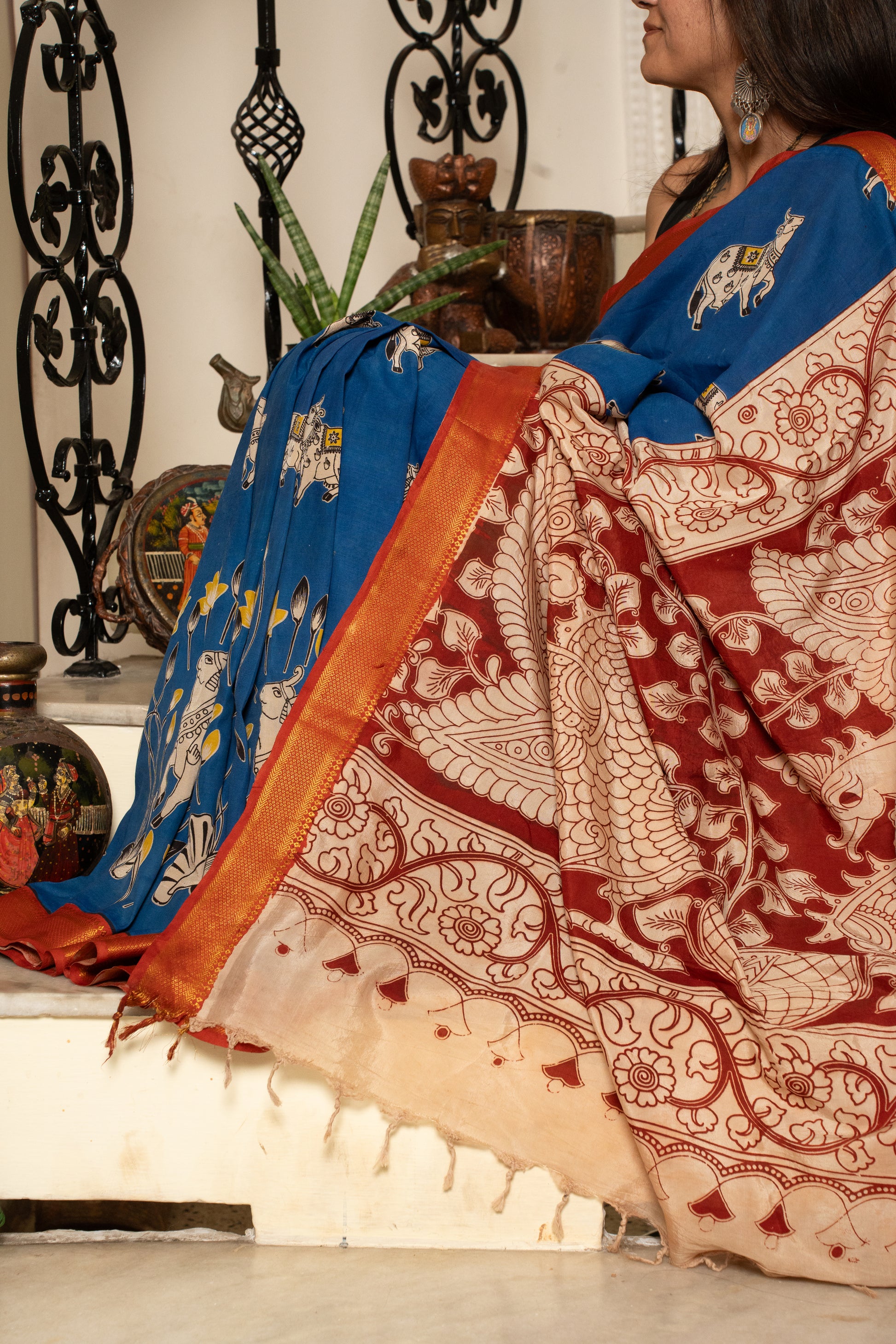 A Chennur Silk saree with Nizam Border in Royal Blue and Red, hand-painted with gentle cow motifs in Kalamkari...