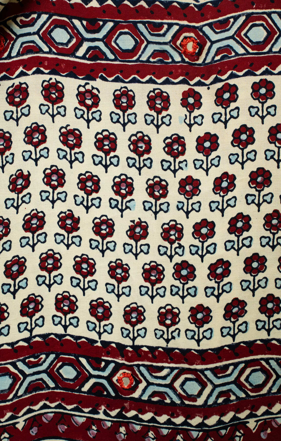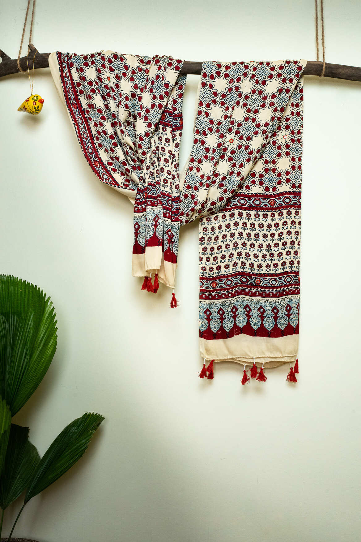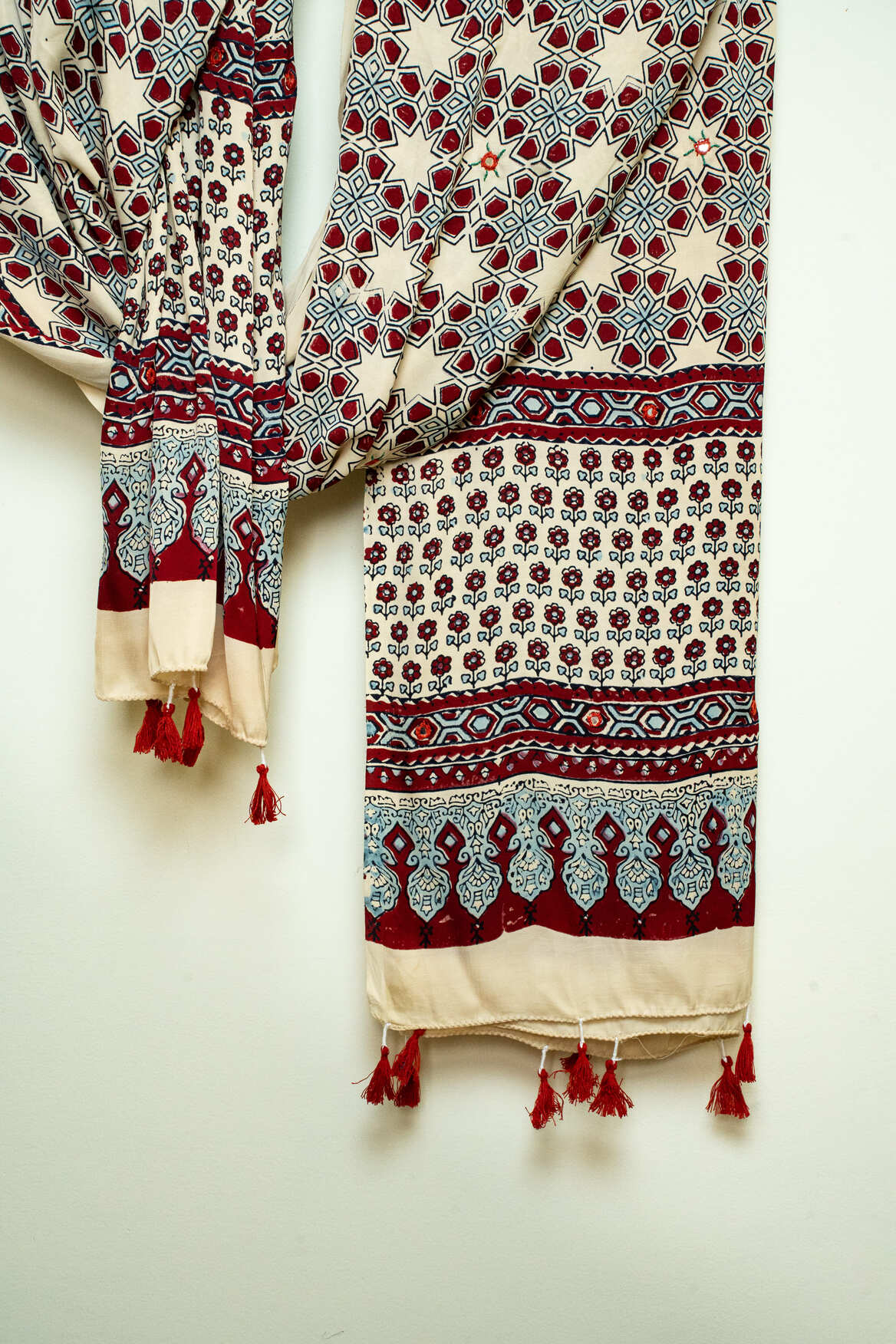 An off-white Modal Silk Ajrakh Dupatta, hand block–printed with geometric motifs in maroon and light blue. Enhanced with Mirror Work...