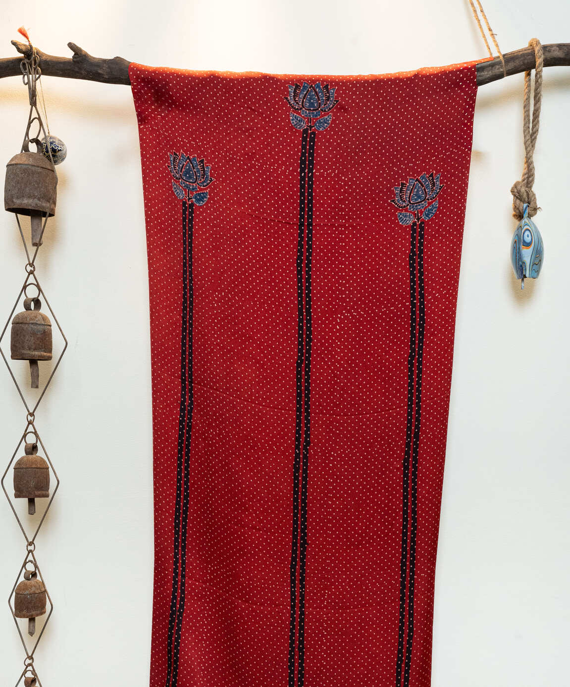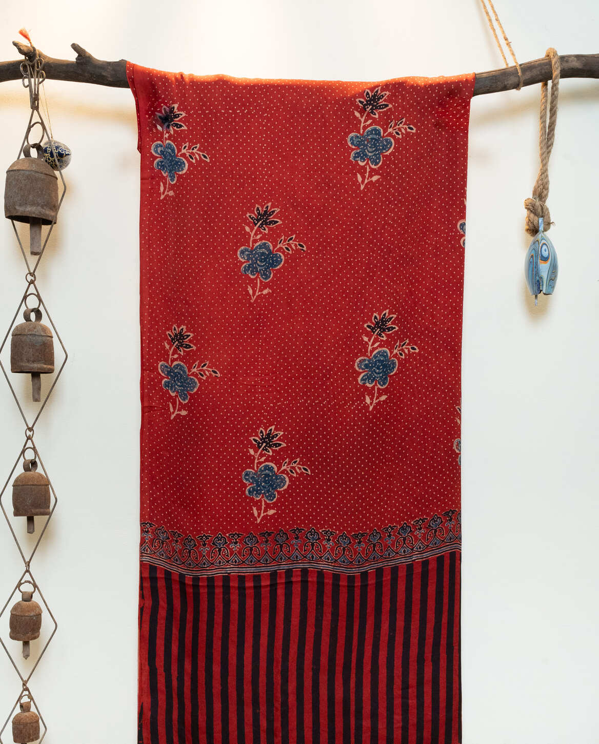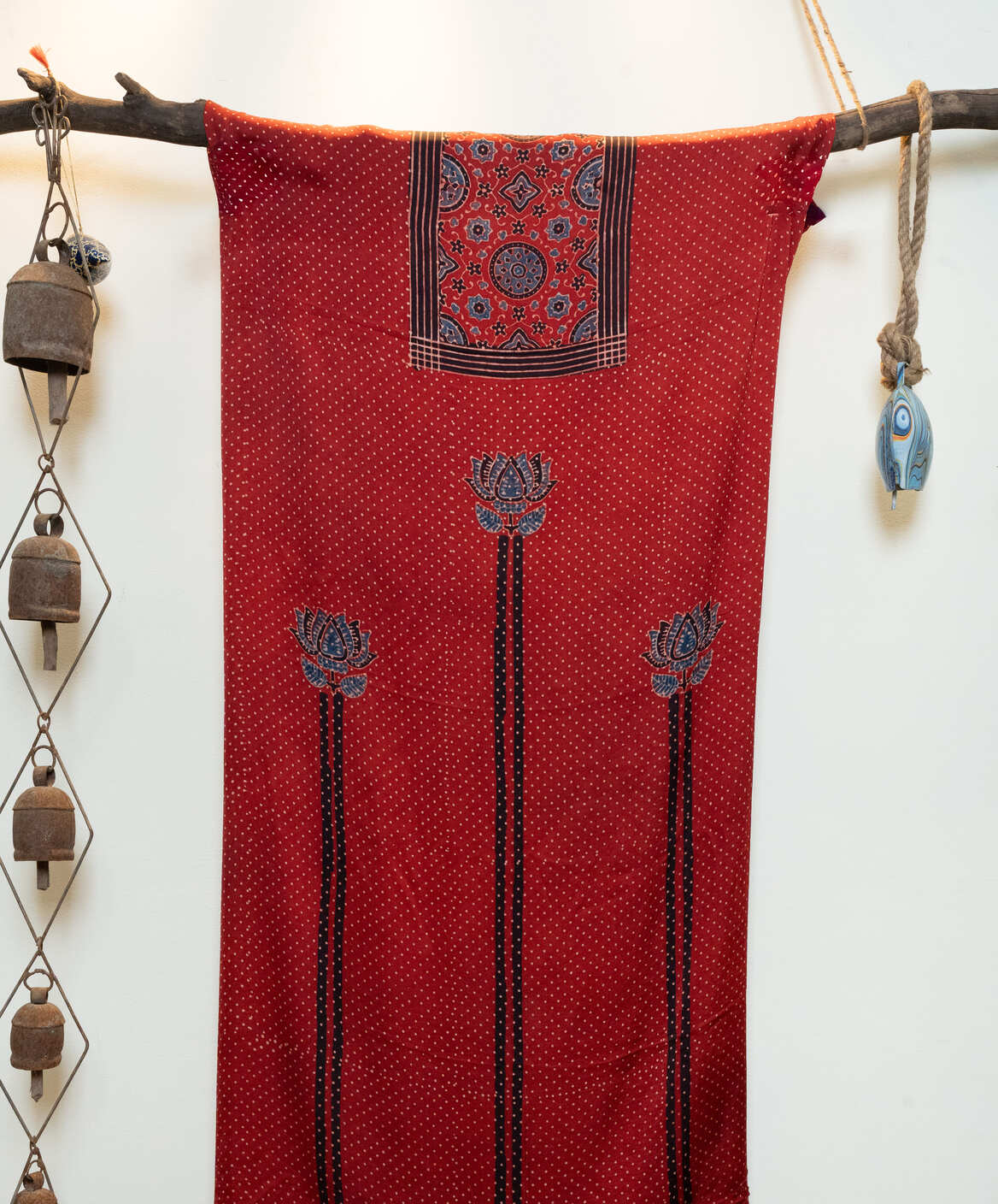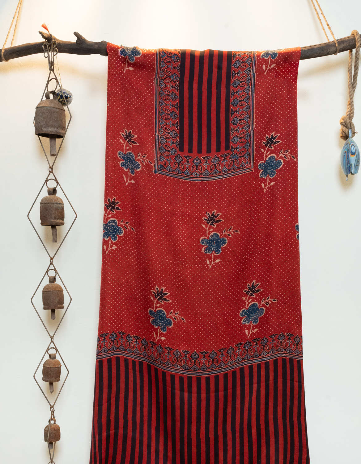 A Pure Modal Silk Ajrakh kurta fabric in deep red, adorned with white dots and vertical lotus-stem motifs. Soft, fluid, and timeless ...