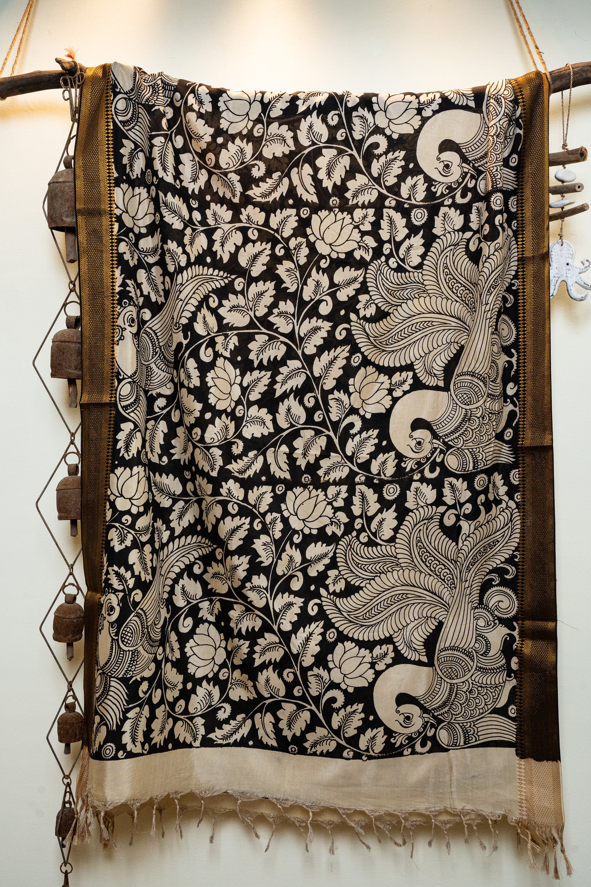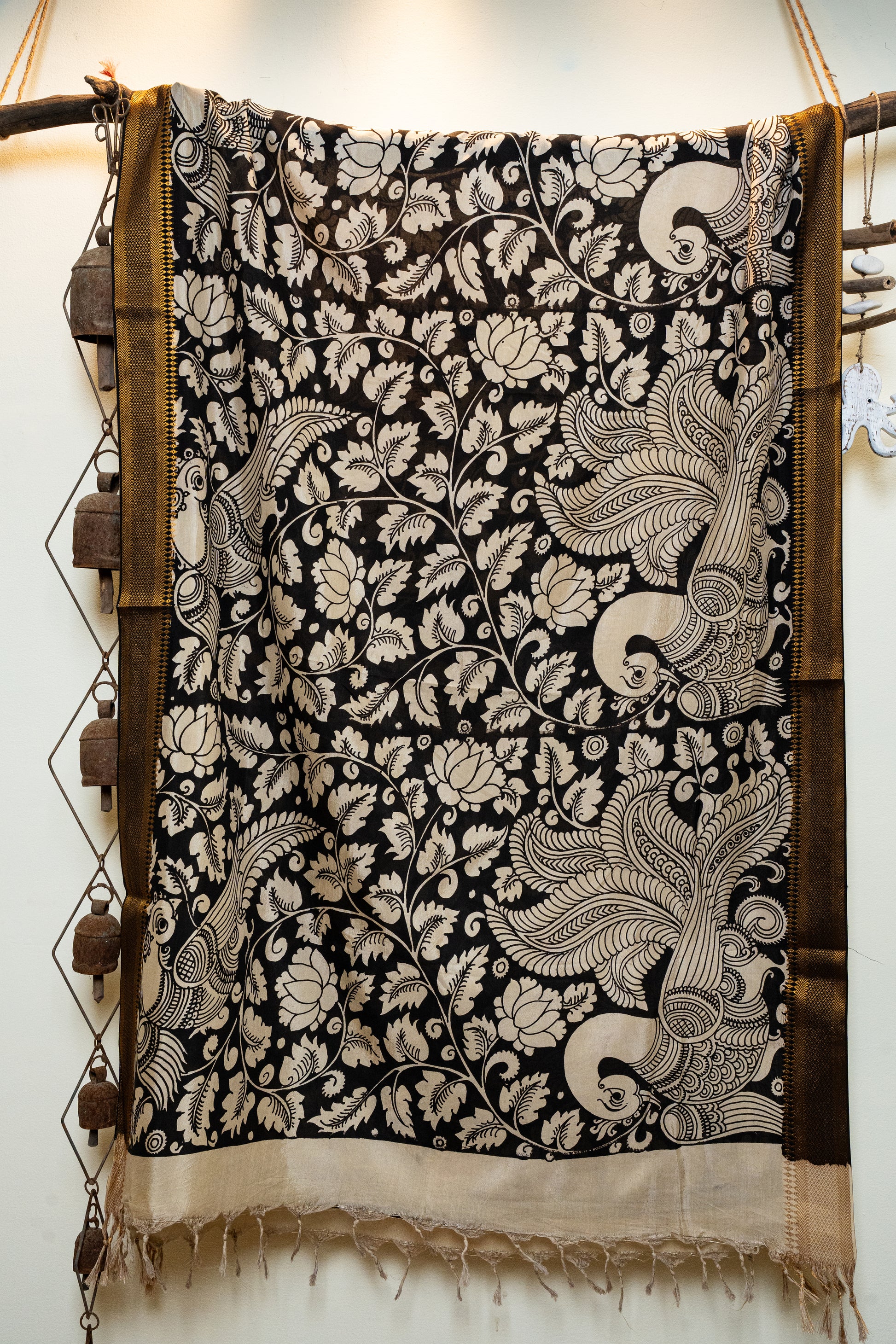 Bold peacocks entwined with lotus vines, hand-painted in timeless Black and White Kalamkari Art