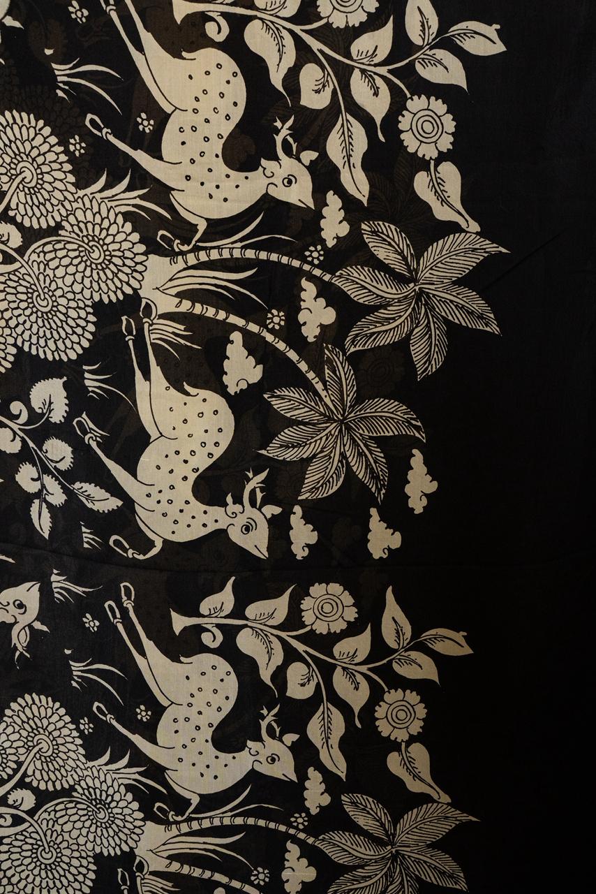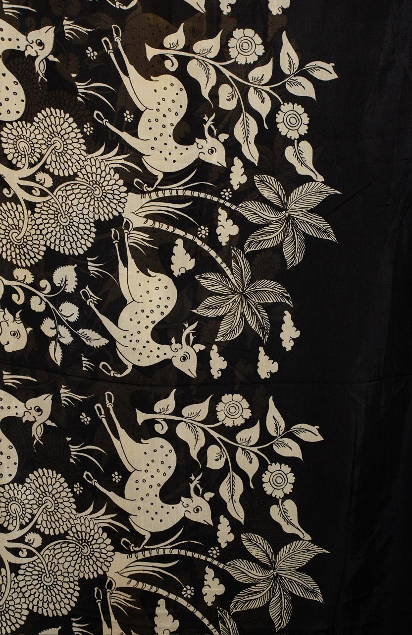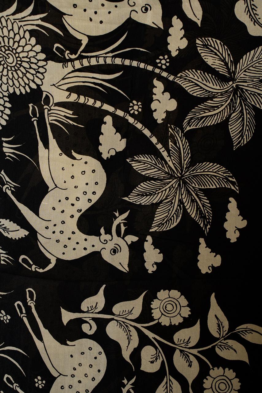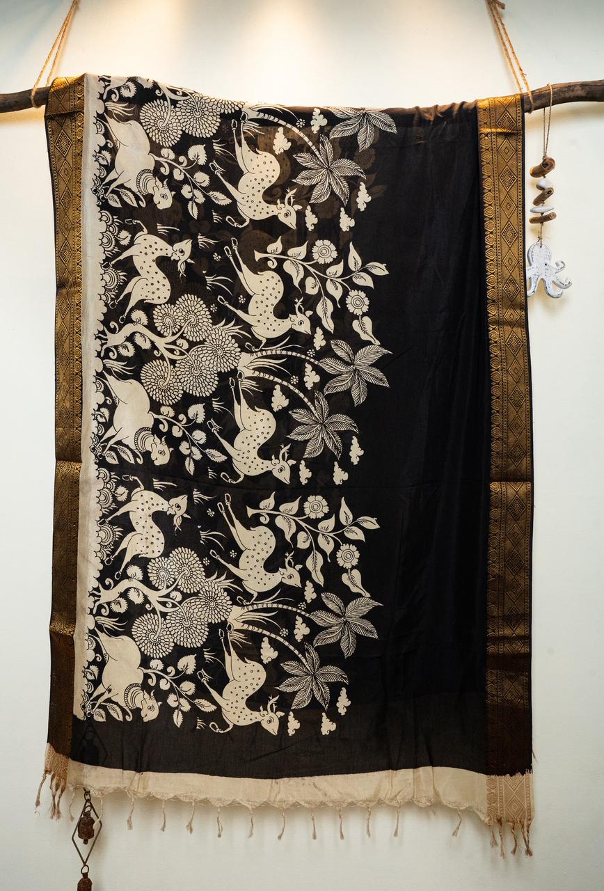 Handcrafted in soft off-white and black tones, this Mangalagiri silk Dupatta features a serene jungle narrative — graceful deers, ancient trees, and gentle cows brought to life through the intricate lines of Kalamkari artistry.