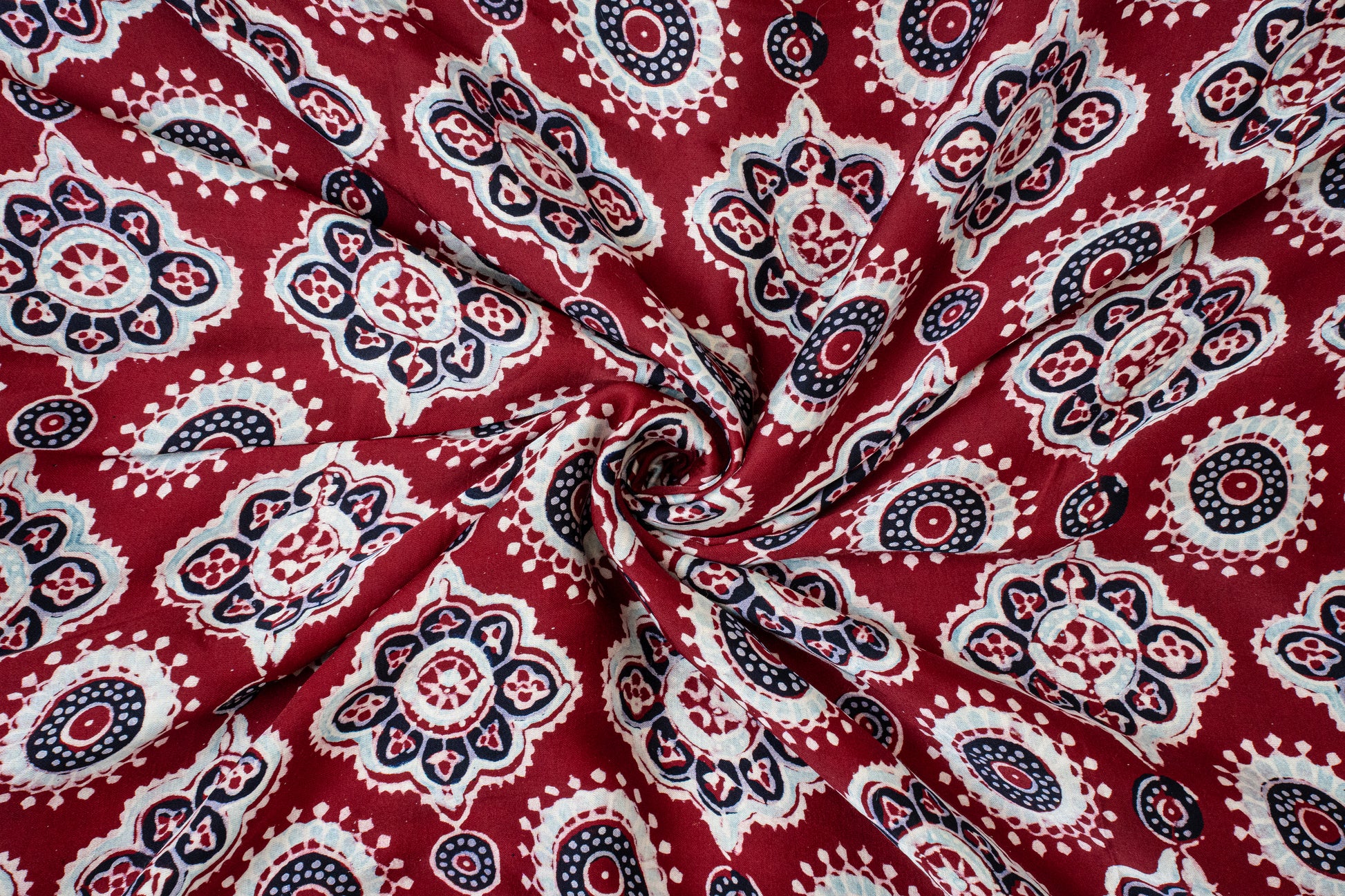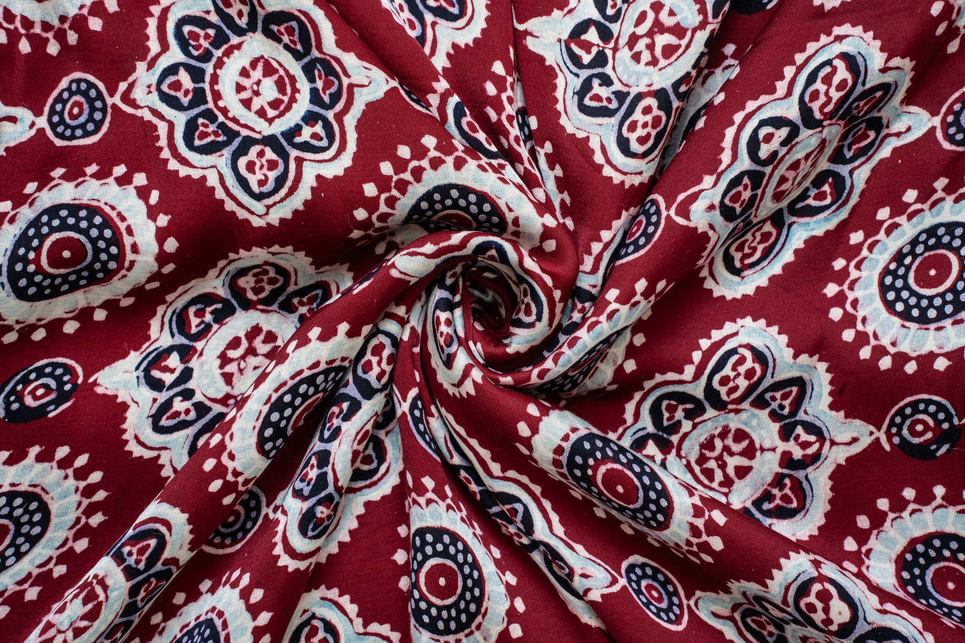 A rich Maroon Pure Modal Silk canvas adorned with White and Blue Ajrakh motifs..