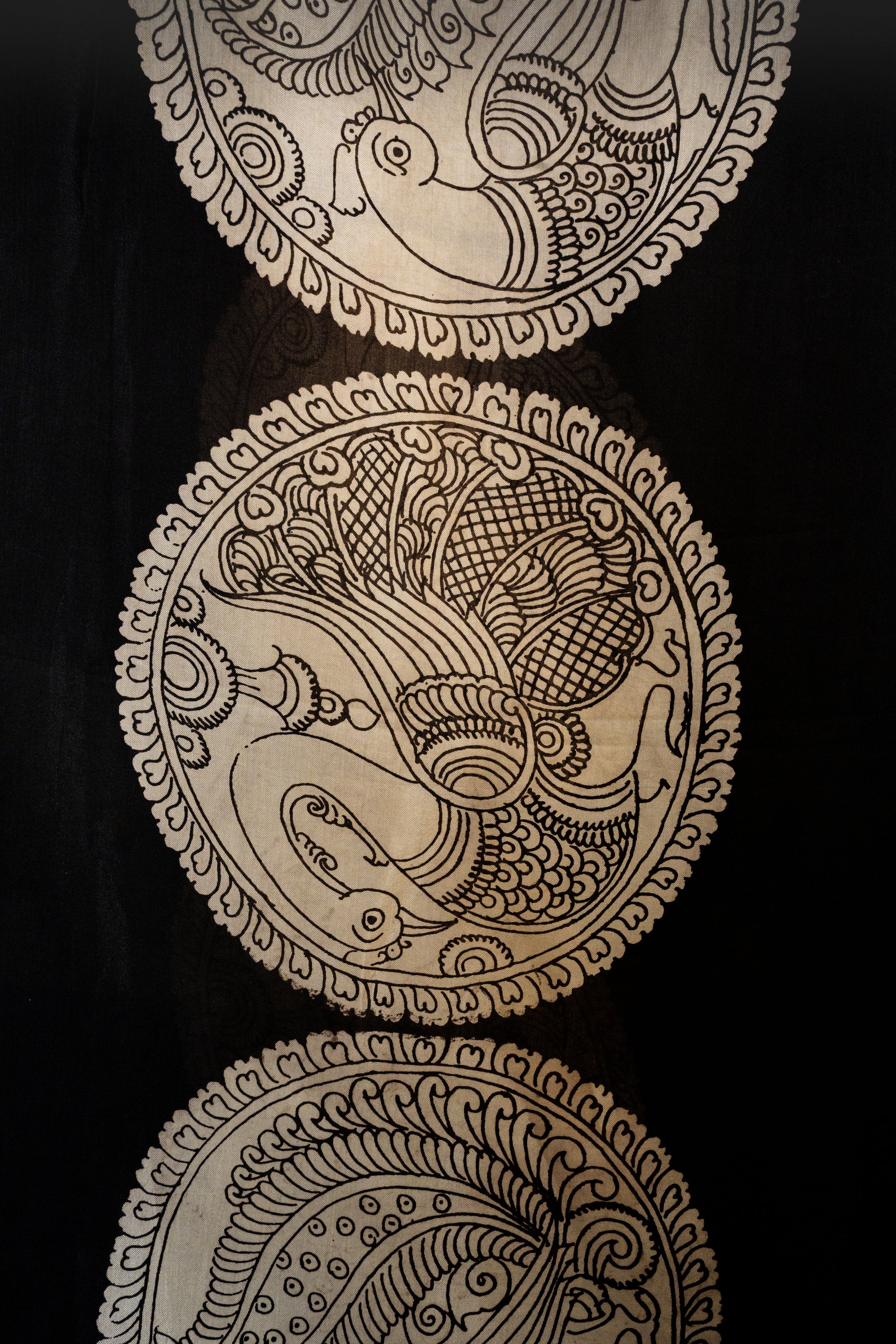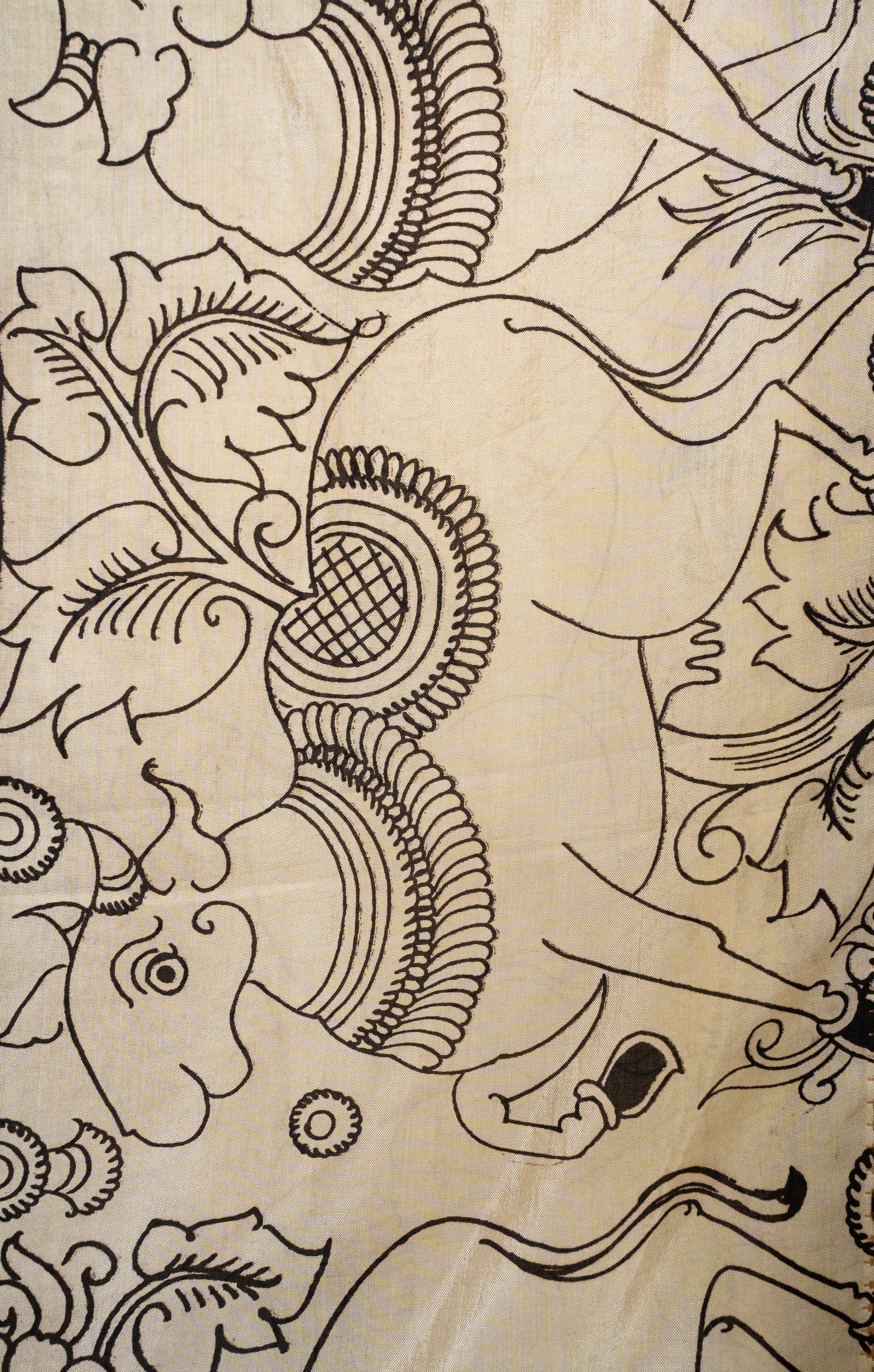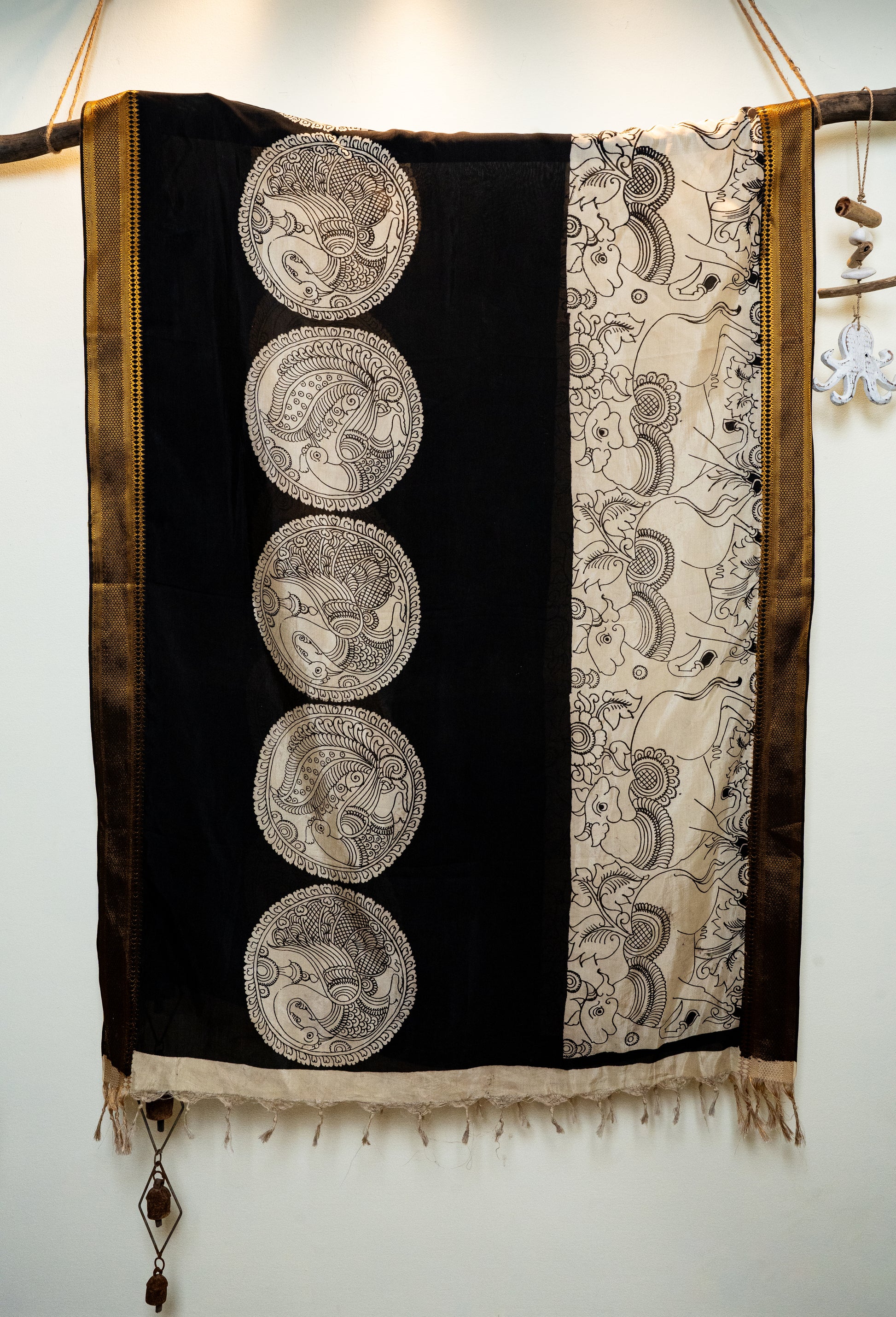 Two worlds, one canvas—Hand-painted Cows and Peacocks in graceful monochrome on soft Mangalgiri Silk.
