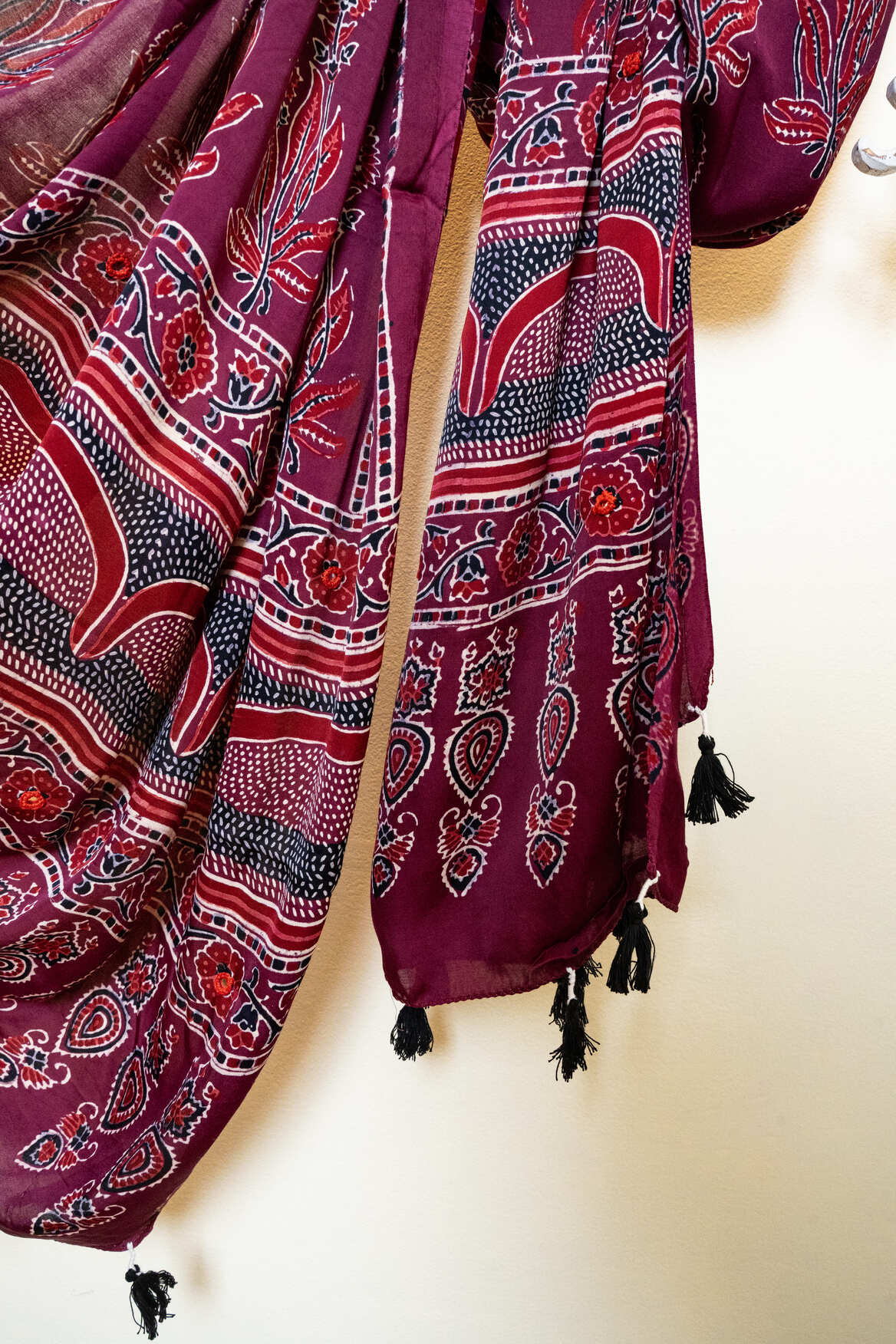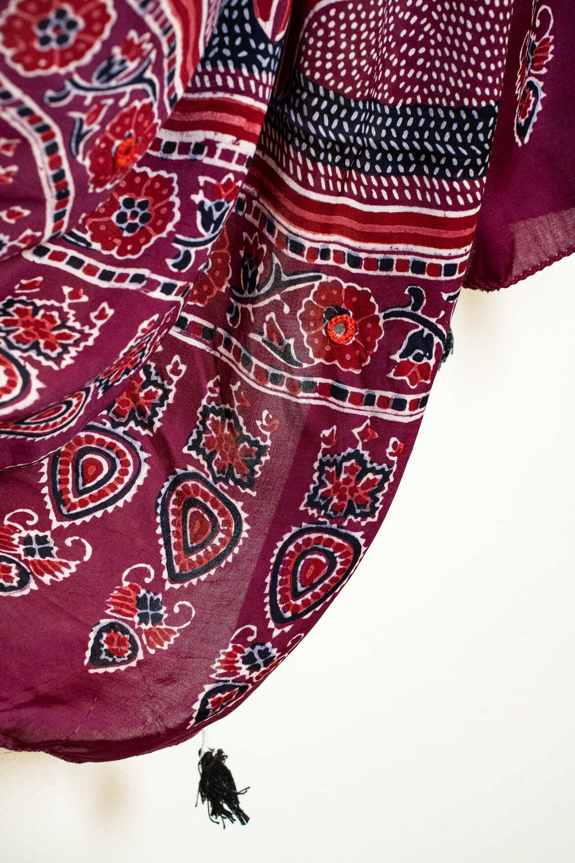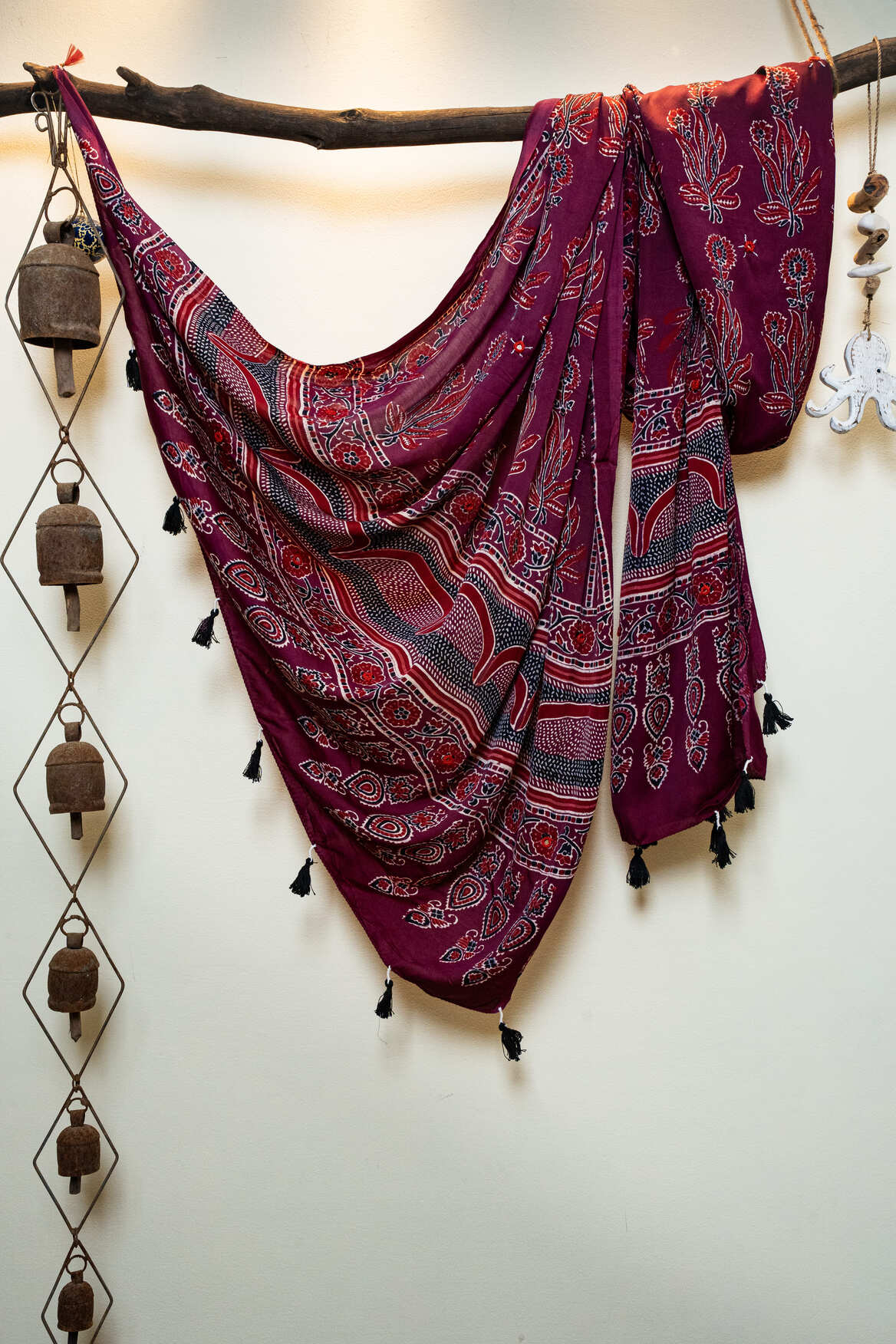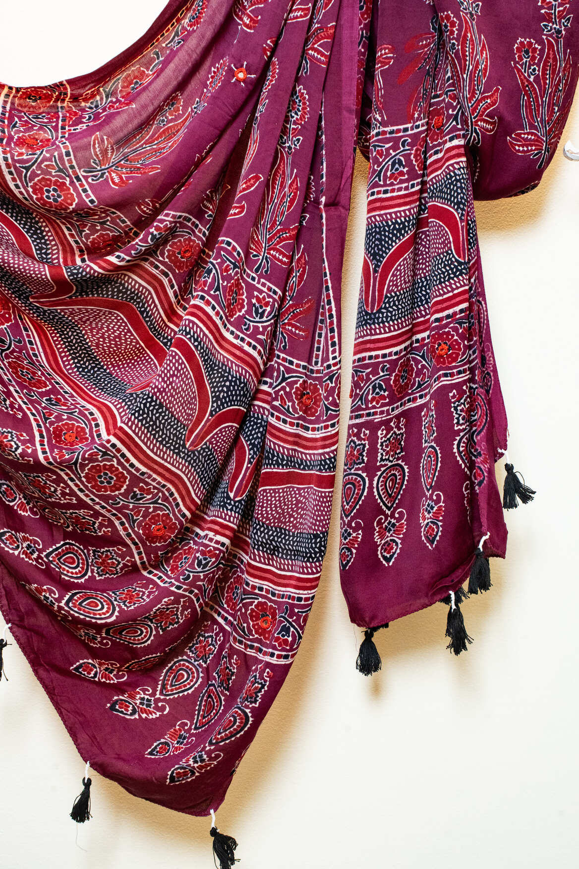 A rich Modal Silk Ajrakh Dupatta in violet-purple hues, hand block–printed with traditional floral motifs enhanced with Mirror work..
