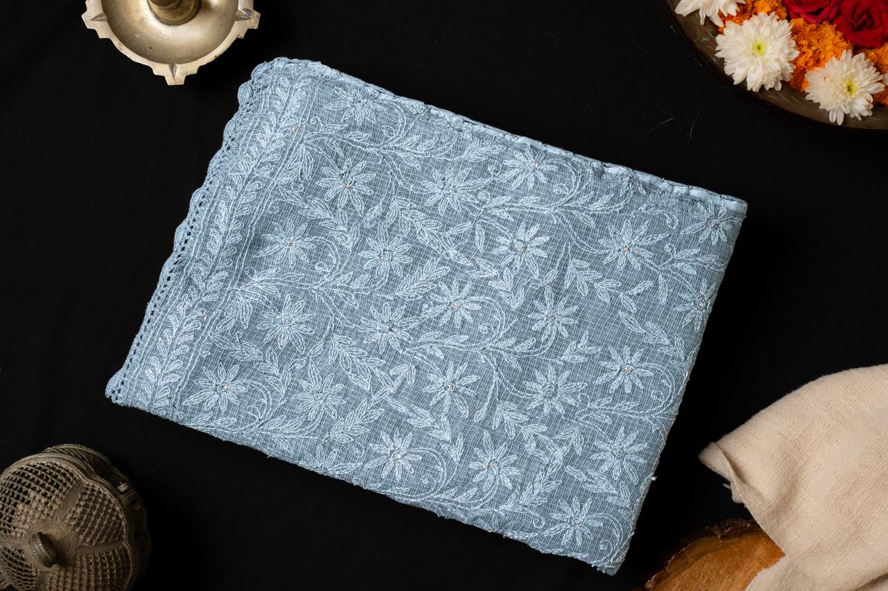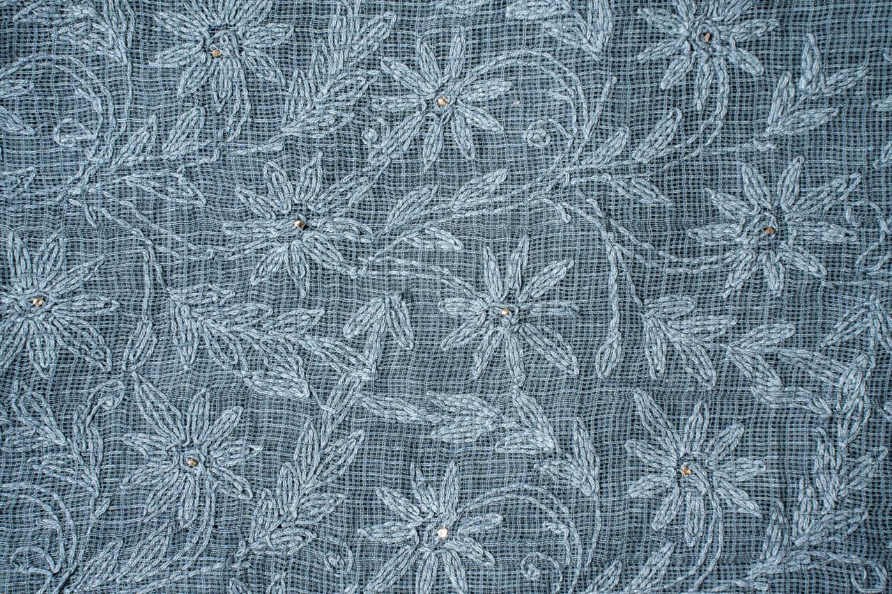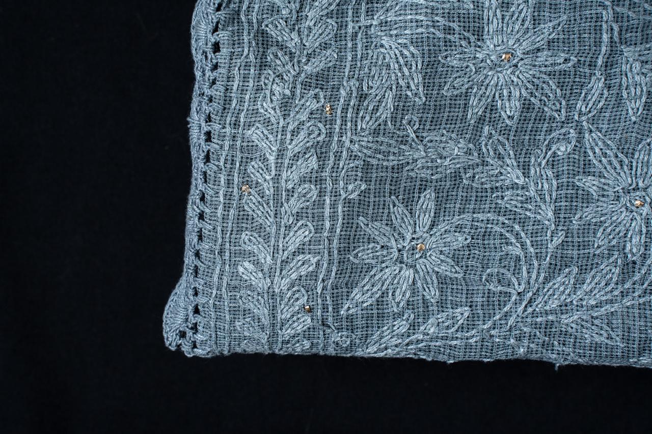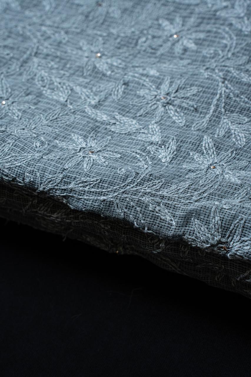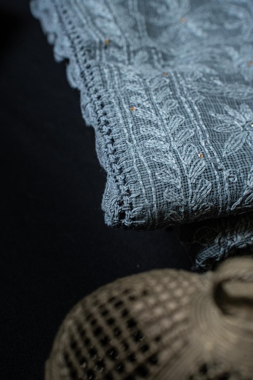 A delicate Kota cotton drape, in Iron Grey hand-embellished with All-Over dense Tepchi embroidery and subtle Mukaish work. Finished with crochet lace along the edges.