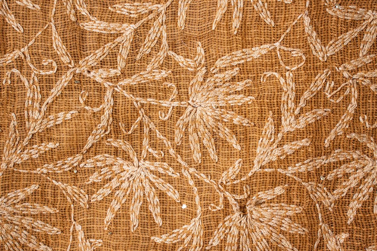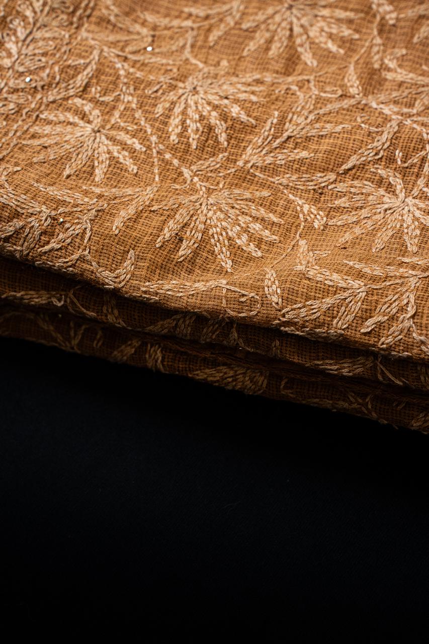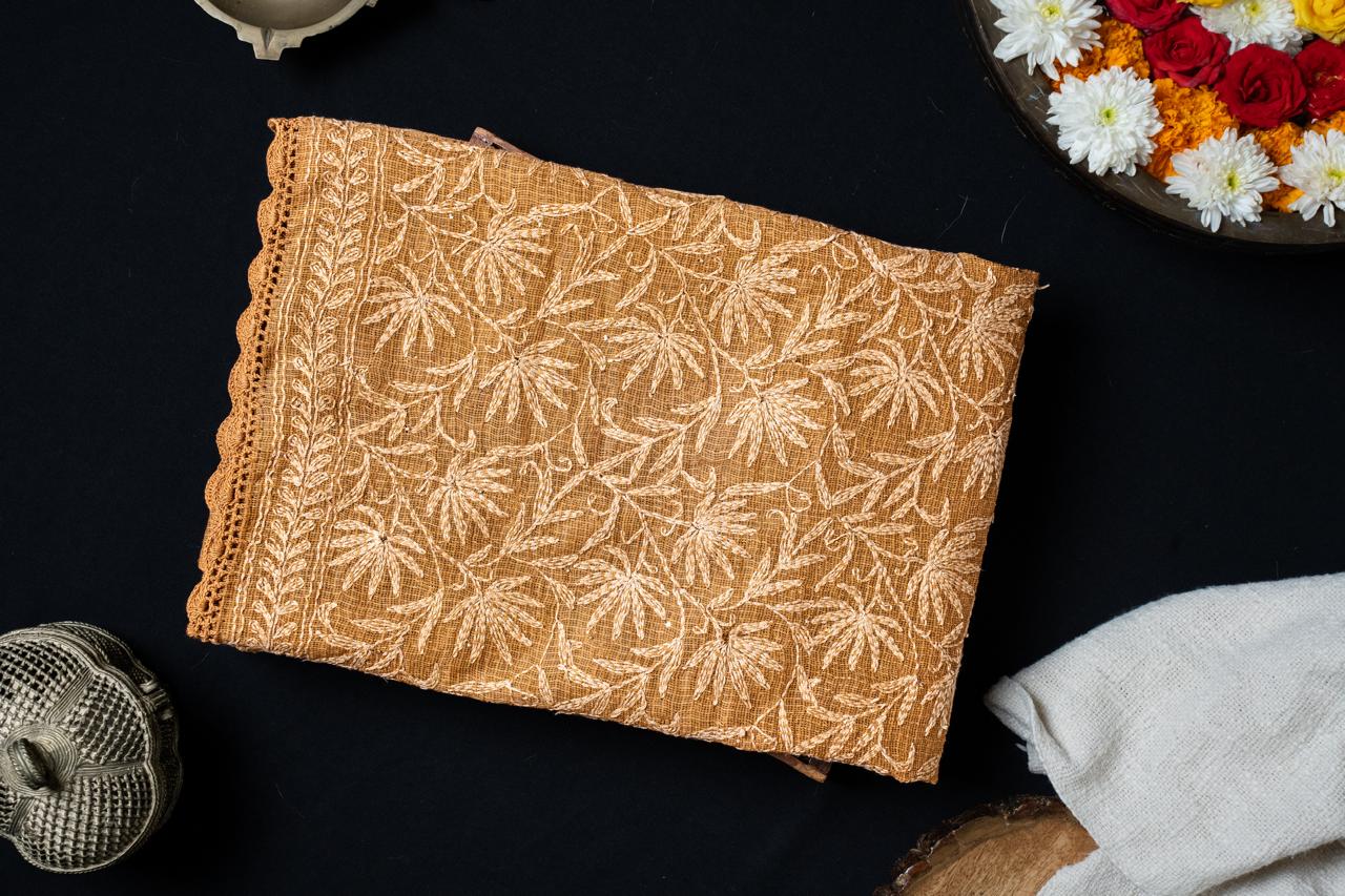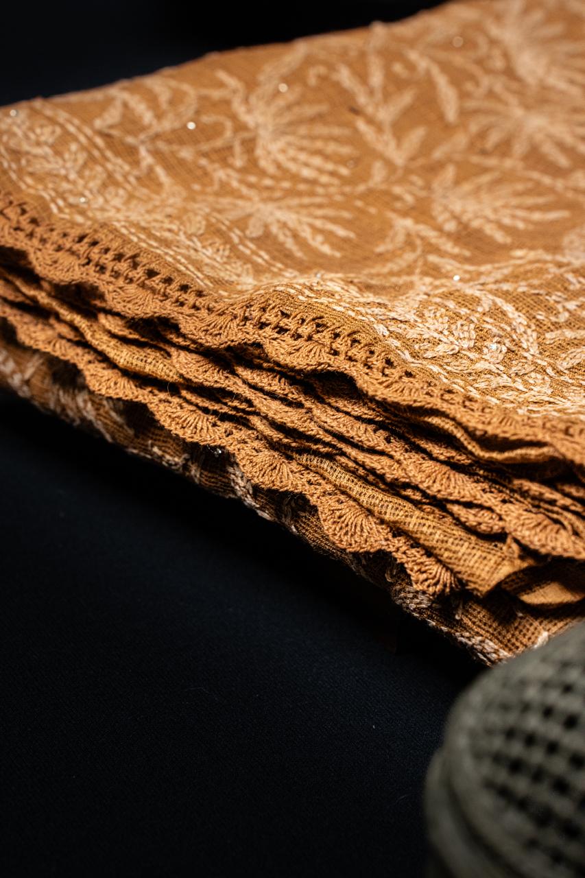 A delicate Kota Doriya drape, in Bronze Brown hand-embellished with All-Over dense Tepchi embroidery and subtle Mukaish work. Finished with crochet lace along the edges.