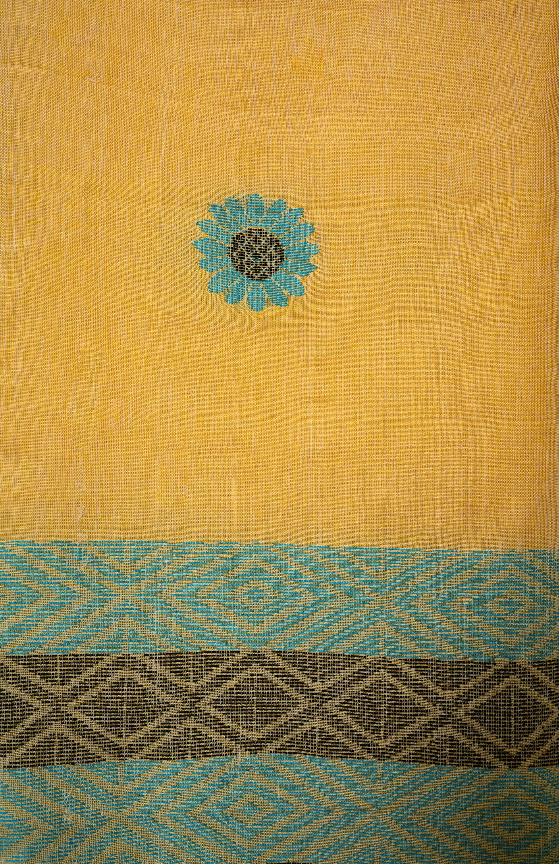 A soft Yellow Canvas with blue-black Jamdani blooms and borders on Pure Cotton by Cotton Fabric. Light, airy, and full of quiet grace.